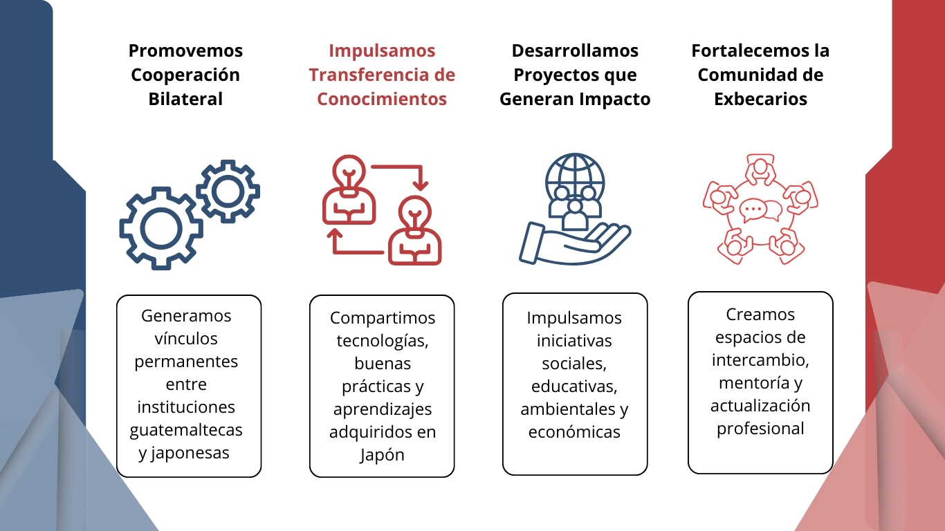 Difundir y promover la adopción de los conocimientos técnicos, científicos y culturales adquiridos en Japón y terceros países, conformando una red de capital social, promoviendo la cooperación y el desarrollo integral de los guatemaltecos.